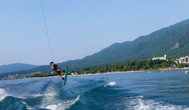 おはようございます🌞 朝からウェイクボード🏄🏽♀️💨 まだまだ琵琶湖に入れる水温です🌊 ウェットスーツの貸し出しもしているので、是非チャレンジしてみてください!!! 本日もいい天気で、BBQ日和になっています🍖 お待ちしております🌴💖